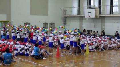 今日は,本校で上京支部育成学級・支援学校合同運動会を行っています。運動場で行う予定でしたが,雨のため体育館で行っています。