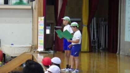 開会式は,全学年が参加しました。入場行進でアーチをつくって迎えたり,みんなで「いっぱいやろう2017」の歌を元気に歌ったりしました。「はじめのことば」では,わかたけ学級6年生がしっかりと発表していました。
