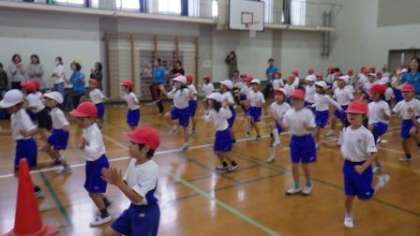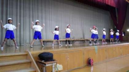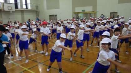 準備体操では「エビカニクス」を踊りました。予定では全校児童が一緒に踊る予定でしたが,雨で体育館での開催になったため,今日は2年生と5年生が一緒に踊りました。