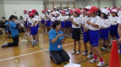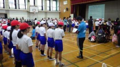 今日の合同運動会の開会式は,タブレットを使って,草の芽学級児童への情報保障を行いました。