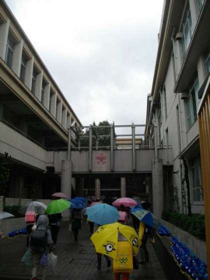 しとしとと雨が降っています。子どもたちは色とりどりの傘をさして登校してきました。