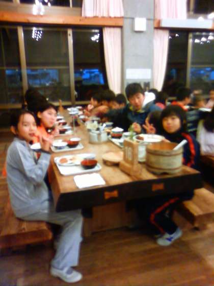 お風呂に入ってすっきりしてから,夕食タイムです。山の家の広い食堂もこれで3回目なので,バイキング方式の食事も慣れてきました。今日は天候もよく月もきれいに輝いています。天体観測が楽しみです。
