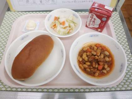 「こくとうコッペパンとだいずとぎゅうにくのとまとにをいっしょにたべたらとてもおいしかったです。」(2年児童)