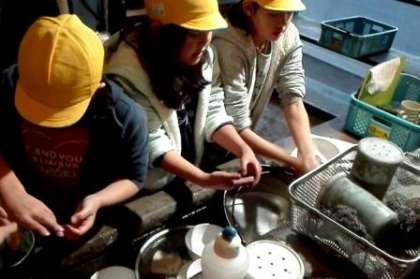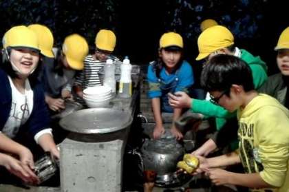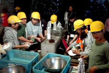 後片付けが始まりました。みんなで協力して鍋や食器を洗ったり,かまどを掃除したりしています。
