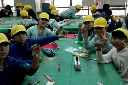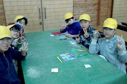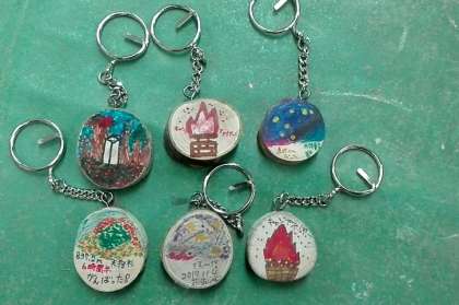 木をやすりでしっかりとみがいて,ペンなどで楽しく描いて,キーホルダーをつくりました。すてきな山の家のおみやげができました。