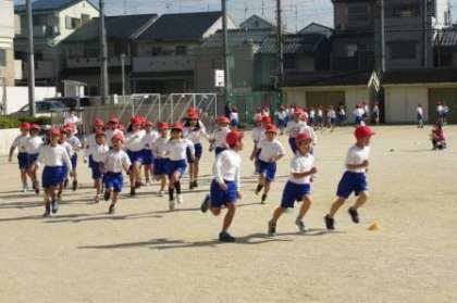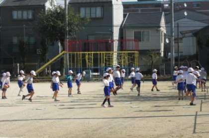 クラスごとに学習しています。「ゆっくりかけあし」や「なわとび」をしています。