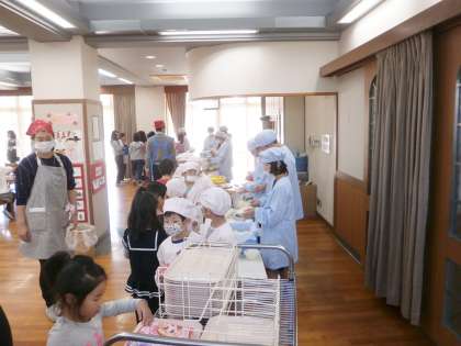今日は,1−1と6−1がランチルームでなかよし給食を実施しました。6年生が,1年生の配膳もお手伝いしてくれました。テーブルでは,6年生が1年生に優しく声をかけながら,味わって給食を食べていました。