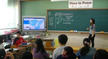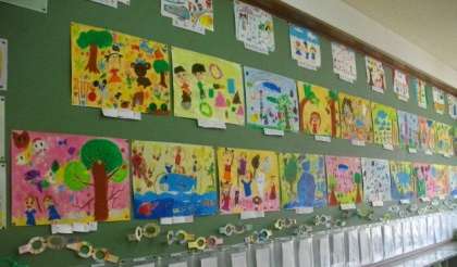 1年生は,国語で,正しい書き方の学習をしています。掲示板には,すてきな絵が飾られています。6年生は,算数で面積を求めています。