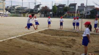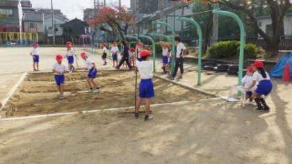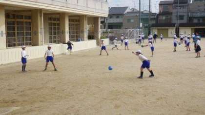 3年3組は,ハンドベースボールの練習をしています。3年2組は,はばとびの学習をしています。場づくりや記録もみんなで分担して活動しています。