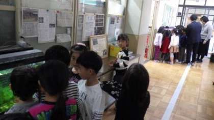 学校でお世話をしている生き物を,みんなで観察しています。