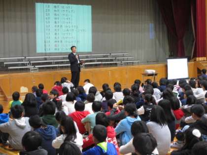 校長先生から,6年生が大文字駅伝の予選会で最後まで頑張っていた様子や,5年生の山の家宿泊学習でみんなが協力して活動していた様子の紹介がありました。