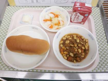 「チリコンカーンがおいしかったです。私のお皿には,チリコンカーンもやさいのホットマリネもたくさん入っていたのでうれしかったです。またおいしいきゅう食をたくさん作ってください。」(4年児童)