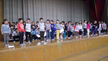 体育館で練習しています。せりふや動き,歌を順番に練習しています。