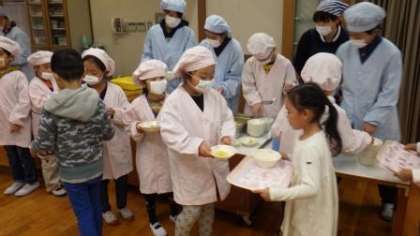 今週は1年2組と6年2組が,なかよし給食を行っています。6年生が配膳を手伝ったり,テーブルで楽しく会話したりして,1年生が楽しく給食をすごせるようにしていました。