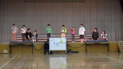 体育館で練習をしています。入場から退場までの流れも確認しました。