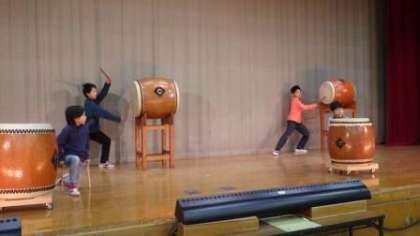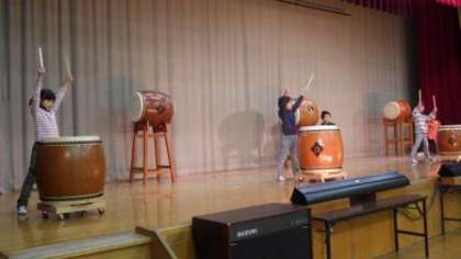 2年生と6年生が,学習発表会での草の芽太鼓の練習をしています。