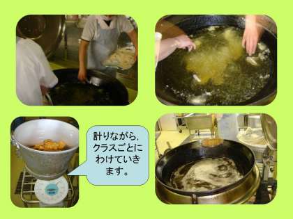 給食室で豚肉に1枚・1枚ずつ,ころもをつけて油であげています。子どもたちは,前の日から,楽しみにしていました。