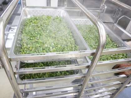 じゃがいものソテーに入っていたアスパラガスは,スチームコンベクションオーブンで蒸してから炒めました。
