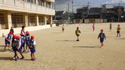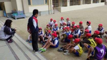 ルールを確認しながら,ハンドベースボールの活動をしています。