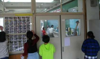 掃除の時間の様子です。先生もいっしょに廊下を掃いたり,ぞうきんでふいたり,机を運んだりしています。窓ガラスも,一枚一枚きれいに拭いています。「もくもく掃除」をがんばっているクラスがたくさんあります。