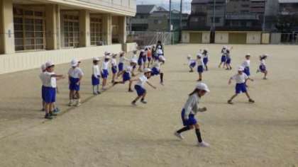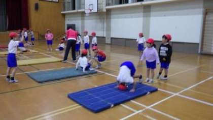 1年1組と3組は運動場でなわとびや「とびくらべ」の活動をしています。1年2組は体育館で「マットあそび」の活動をしています。