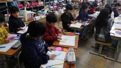 色紙でつくった形をつかって,三角形や四角形の学習をしています。