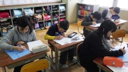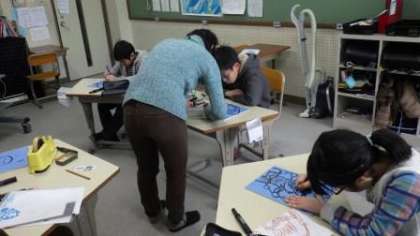 下絵を版木に写したり,彫刻刀で彫り始めたりしています。