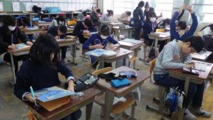 彫刻刀で彫っています。彫り終えた児童から順番に刷っています。