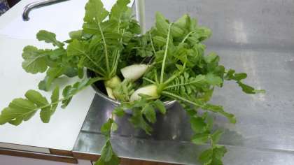 「わかたけ農園」で育てた大根を,先日収穫しました。今日は,収穫した大根を使って調理実習をしています。
