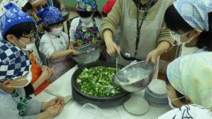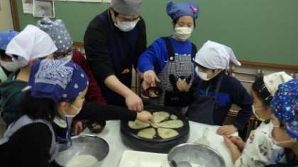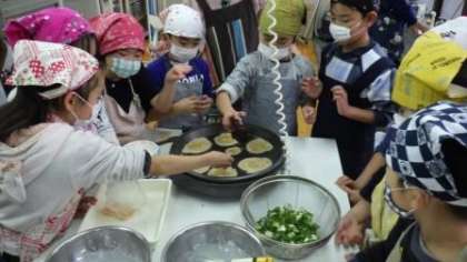 収穫した九条ねぎを使って,ねぎやきの調理実習をしています。1・2時間目は3年1組と3年わかたけ学級が調理実習をしました。
