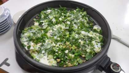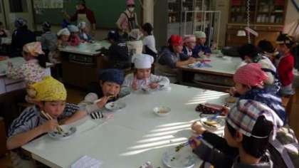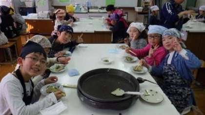 収穫した九条ねぎを使って,5・6時間目は3年3組がねぎやきの調理実習をしています。「おいしい」「ねぎがあまい」と,自分たちでつくったねぎやきを嬉しそうに味わっていました。