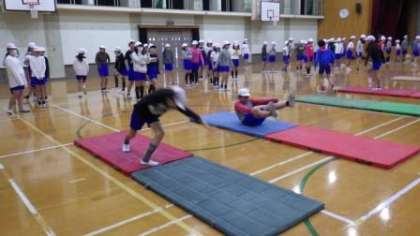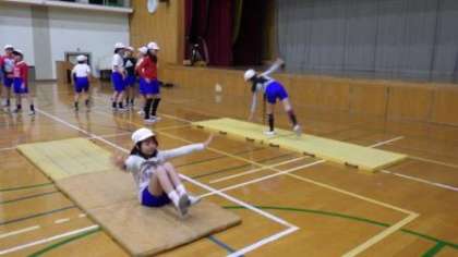 体育館でマット運動の学習をしています。開脚前転や開脚後転,側転など,いろいろな技に挑戦しています。