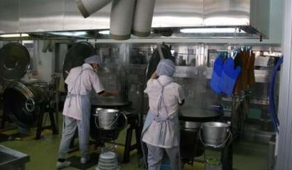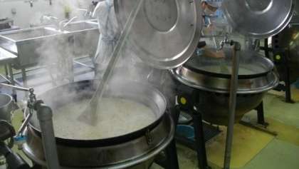 今日のメニューは,「豆乳のクリームシチュー」です。できたての給食が提供できるように,配食する時間にも気を使って作業をしています。