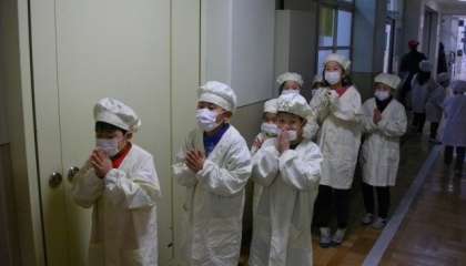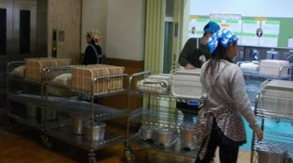 子どもたちが,エプロンに着替えて給食の準備をしています。
