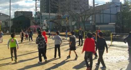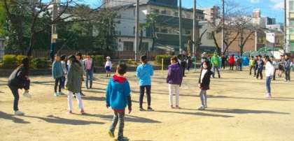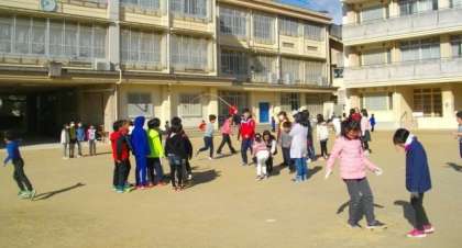 やわらかな日差しです。運動場は少しぬかるんでいるところがありますが,そこを避けて縄跳びやドッヂボールに親しんでいます。