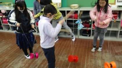 教頭先生が以前に働いていた中国・上海の話をしてくださいました。中国語のクイズや中国ごま(空竹)を楽しみました。昼休みも,中国ごまでうれしそうに遊んでる子どもたちがいました。