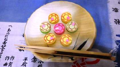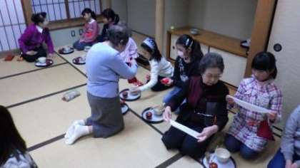 「茶道入門」と「ひなまつり茶会」を前に,おけいこをがんばっています。地域の先生方に,作法をていねいに教えていただいています。
