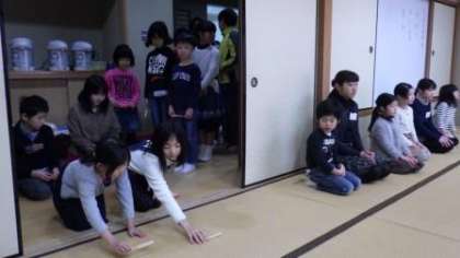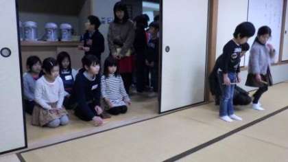 土曜学習「茶道入門」が始まりました。1・2年生の希望者が茶道部の子どもたちに作法を教えてもらいながら,茶道を体験します。みんな楽しみにしています。