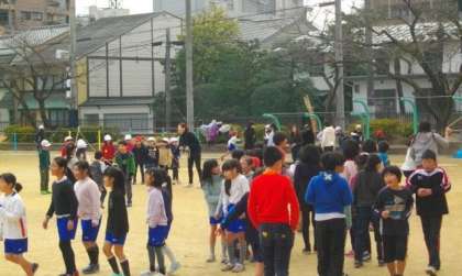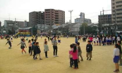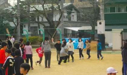 たくさんのお友達が,外で大縄跳びに挑戦しています。