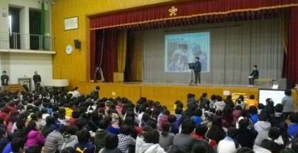前回の朝会では,タブレットへ音声を入力するための専用マイクを使用しましたが,今日は,【スピーカーの近くにタブレットを設置すること】を試みました。「誰もいない体育館」で事前に試したときと比べると,文字への変換率は若干落ちてしまいましたが,マイクの音量や話し方を工夫することで,活用の幅が広がりそうです。