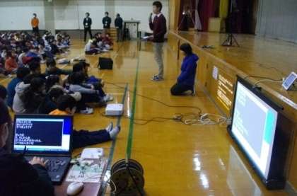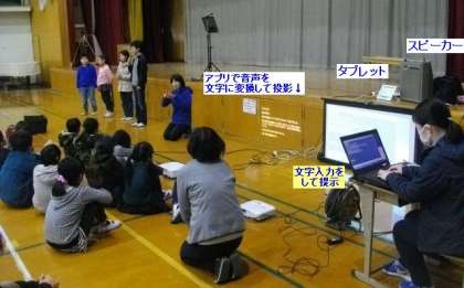 本校では,情報保障の取組の一つとして,作文発表内容を事前にテキスト化し,コンピュータの専用ソフトを使ってその内容を提示することを進めています。また,児童の感想はその場で聞き取りながらキーボードで入力して提示することも進めています。