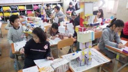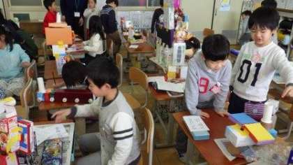 自分の作品や友達の作品を鑑賞しています。いいなと思うところをカードに書いています。