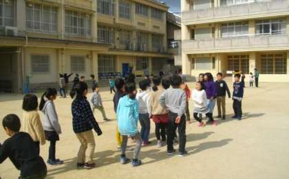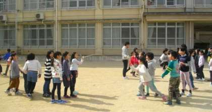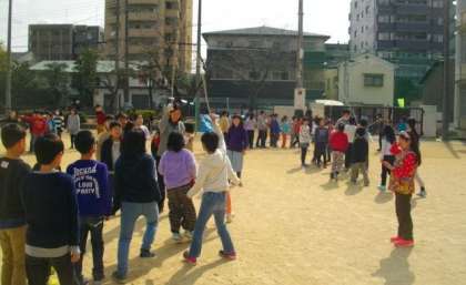 運動場でたくさんの子どもたちが大縄跳びに挑戦しています。