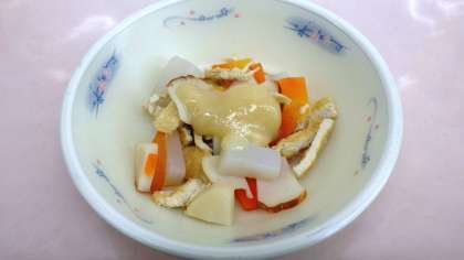 給食では,かまぼこ,油あげ,にんじん,こんにゃくを煮たものに,手作りの酢みそをかけて食べます。