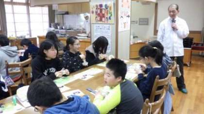 今日も有職料理で名高い地域の料亭「萬亀楼」さんに来ていただきました。だしについての話を聞いたり,大根の煮物を食べ比べたりしています。大根を水で炊いたものとだしで炊いたものを食べ比べてみて,子どもたちからは「ぜんぜんちがう」「だしの方がおいしい」とたくさんの感想がでていました。