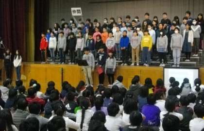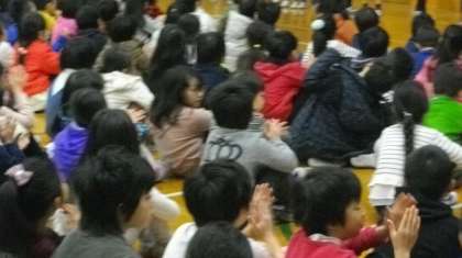 今日のなかよしタイムは,6年生の発表です。6年間を振り返って心に残ったこと,思い出に残ったこと,がんばってきたこと等を「仲間」「協力」「笑顔」「思いやり」の4つのキーワードを使って発表しました。