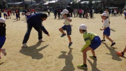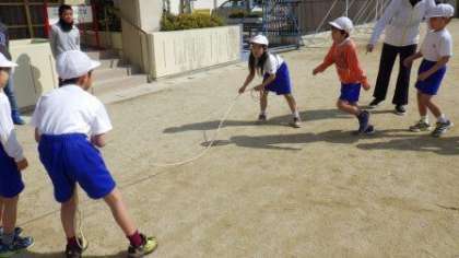 今日は1年生が大なわ大会をしています。スポーツ保健委員会の5・6年生が司会進行や記録係を担当し,楽しい大会にしています。