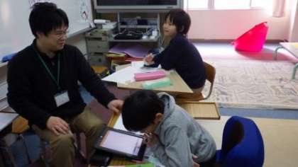 プリントを使って算数の学習をしたり,タブレットを使って音読の練習をしたりしています。