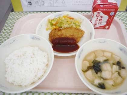 「トンカツとごはんがよくあっていておいしかったです。みそしるのふがふわふわしていておいしかったです。やさいのソテーがキャベツがシャキシャキしていたのと,コーンがよく合っていてとてもおいしかったです。」(2年児童)
