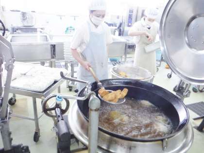 野菜のソテーのキャベツ・人参・コーンはスチームコンベクションオーブンを使用して,蒸してから,釜で炒めました。野菜の甘みやうまみがありました。